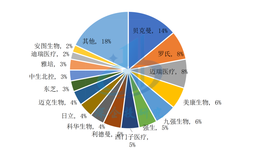 血液诊断仪器主要有血液分析仪和凝血分析仪。血液分析仪(血细胞分析仪、血球分析仪)的国产替代较为深入,国内市场主要由日本希森美康和迈瑞医疗占据,两家市场份额照壁超过80%,其他国产品牌还有帝迈生物、百特生物、迪瑞医疗、特康科技、优利特等,未来国产化率将进一步提升。凝血分析仪目前由外资主导,日本希森美康、法国思塔高、德国BE等占据绝对优势,国产企业主要有赛科希德、普利生(迈瑞医疗)、上海太阳生物等,市场份额较少。