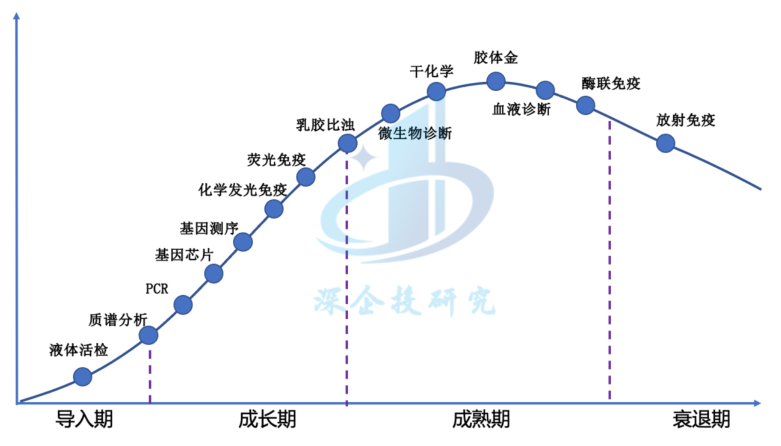 从主要技术的应用情况看,目前生化诊断技术成熟,检测成本低,在基层市场的市占率高;免疫诊断目前市场占比最高,其中化学发光带动新一轮技术革新和市场增长;分子诊断多用于传染病和产前筛查,目前以二代基因测序为主,肿瘤早筛领域将成为最大的增长空间;微生物诊断和血液诊断的占比较低,其中微生物诊断市场相对封闭,临床微生物检测发展较快,血液诊断临床已基本普及,增长空间有限。主要技术手段的生命周期如下图所示。