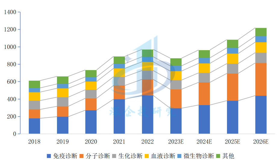 图3 2018-2026年全球体外诊断各细分领域市场规模(亿美元)