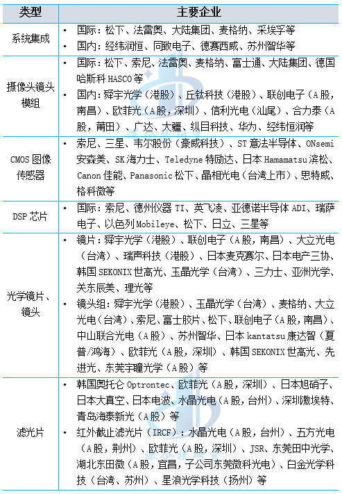 松下、法雷奥、富士通、大陆集团、麦格纳、索尼、MCNEX等海外厂商均有一定份额,国内头部企业包括舜宇光学、联创电子、欧菲光等。从产业链各环节看: