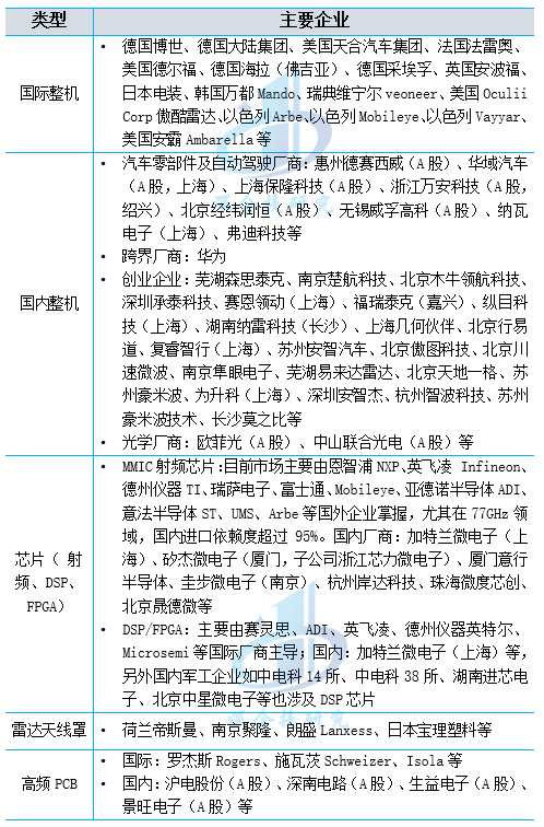 表4 全球及我国毫米波雷达主要企业