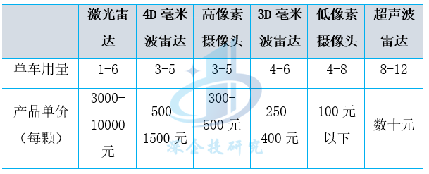 表2 智能驾驶各类传感器预计单车用量及当前价格
