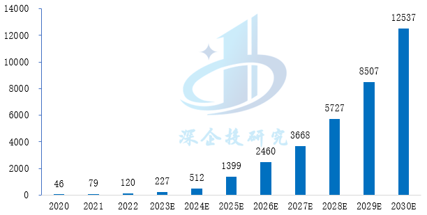 图2 2020-2030年全球激光雷达解决方案市场规模(亿元)