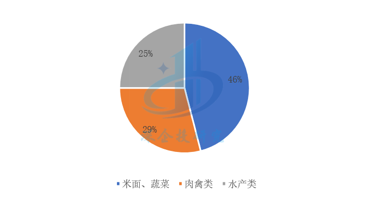 米面、蔬菜类预制菜占比最大。细分品类来看,我国预制菜市场主要分为肉禽预制菜、水产预制菜与米面、蔬菜类预制菜。2022年,米面、蔬菜类预制菜市场规模为1925亿元,占预制菜市场份额约46%,占比最大;肉禽预制菜与水产预制菜在预制菜市场的占比分别为29%与25%。