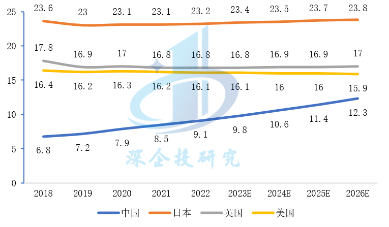 预制菜行业快速增长。据艾媒咨询数据,2019-2022年,我国预制菜的市场规模从2445亿元增加至4196亿元,预计2026年我国预制菜市场规模将超万亿元。从人均消费量角度,2022年我国人均预制菜消费量为9.1KG,同期美、英、日的人均预制菜消费量分别为16.1KG、16.8KG、23.2KG,仍然有较大的提升空间。