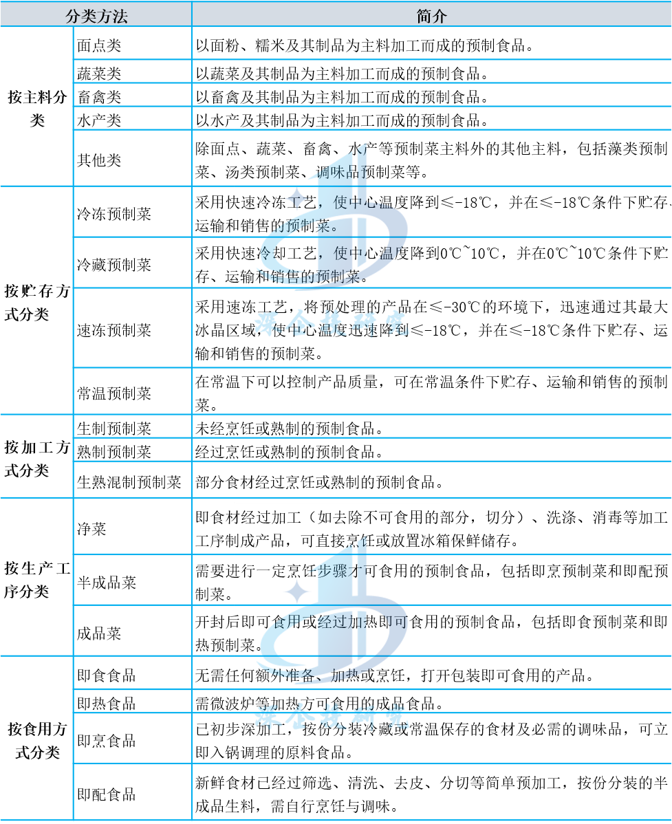 按照食用方式及加工程度,预制菜可分为即食食品、即热食品、即烹食品与即配食品;按照生产工序,预制菜可分为净菜、半成品菜和成品菜。即配净菜早已在商超、农贸市场、各类食堂、连锁餐饮中广泛应用。预制菜具体分类如下表所示。