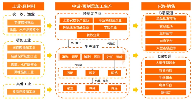 渠道设施完善提供支撑。线上线下消费渠道不断丰富,从传统线下农贸市场、商超到外卖点餐平台、线上购物平台、社区电商平台、直播电商平台、内容社交平台等新兴零售渠道,预制菜对消费者的触达不断提升。冷链运输技术的发展和仓储物流体系不断完善,大幅减少预制菜配送损耗,我国冷链物流体系的逐步成熟又为预制菜行业发展提供了重要保障。