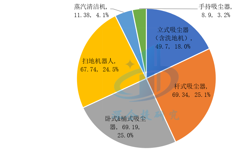 清洁电器是用于清洁物品和室内环境的电器,主要包括吸尘器(杆式吸尘器、桶式吸尘器、卧式吸尘器、手持吸尘器),以及新兴品类扫地机器人、洗地机、除螨仪等。其中,杆式吸尘器、卧式及桶式吸尘器、扫地机器人占据全球主要份额。根据欧睿咨询数据,2022年全球清洁电器市场销售额276.22亿美元,同比增长3.5%,零售量1.47亿台,同比下降2.2%。其中,杆式吸尘器、卧式&桶式吸尘器、扫地机器人销售额分别为69.33亿美元、69.19亿美元、67.74亿美元,合计占比74.6%,如下图所示。