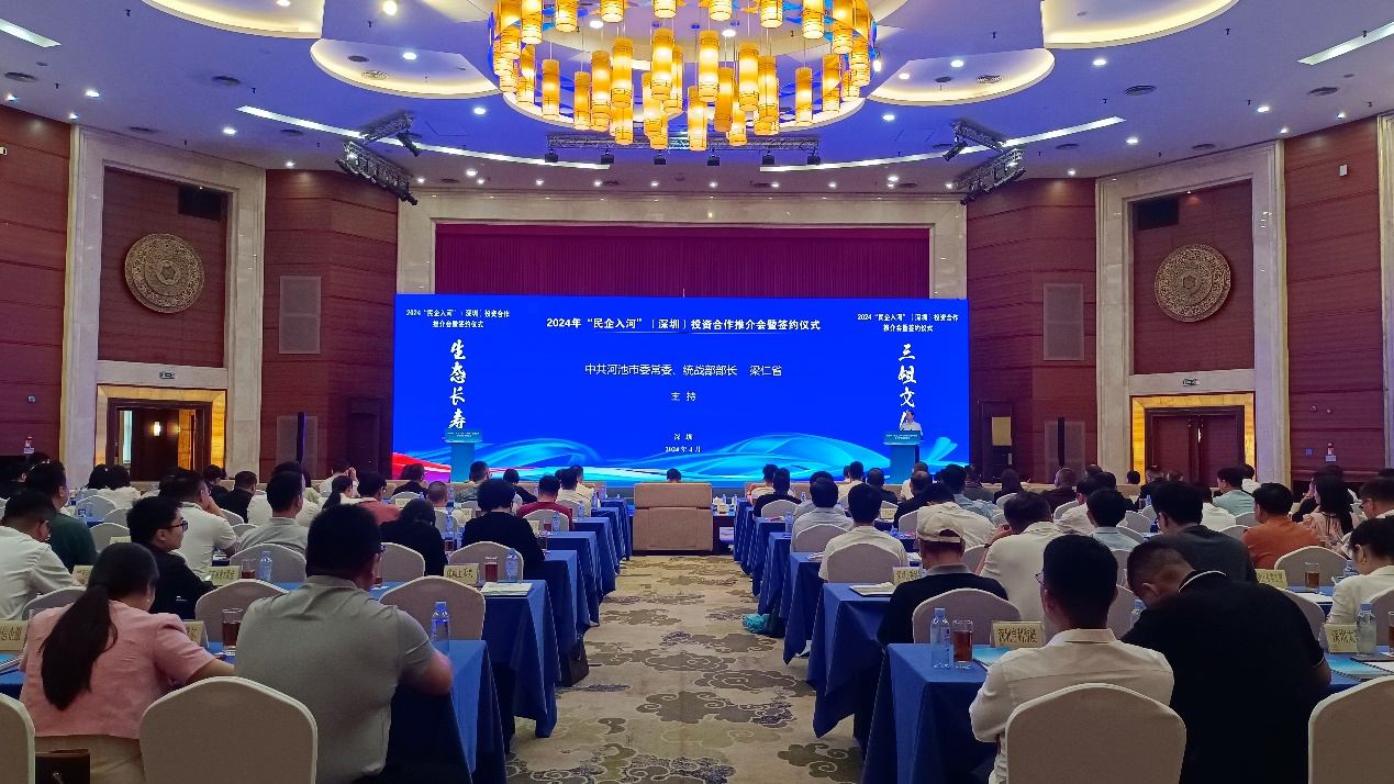 为充分发挥统一战线联系广泛、资源丰富等优势,进一步宣传、推介河池特色优势资源和良好投资环境,力争引进一批龙头企业、建链补链强链延链企业和优质项目,助推河池经济高质量发展。2024年4月26日上午,由广西壮族自治区党委统战部主办,河池市委统战部、市投资促进局、市工商联承办的 2024 年“民企入河”(深圳)投资合作推介会暨签约仪式在深圳五洲宾馆举办。