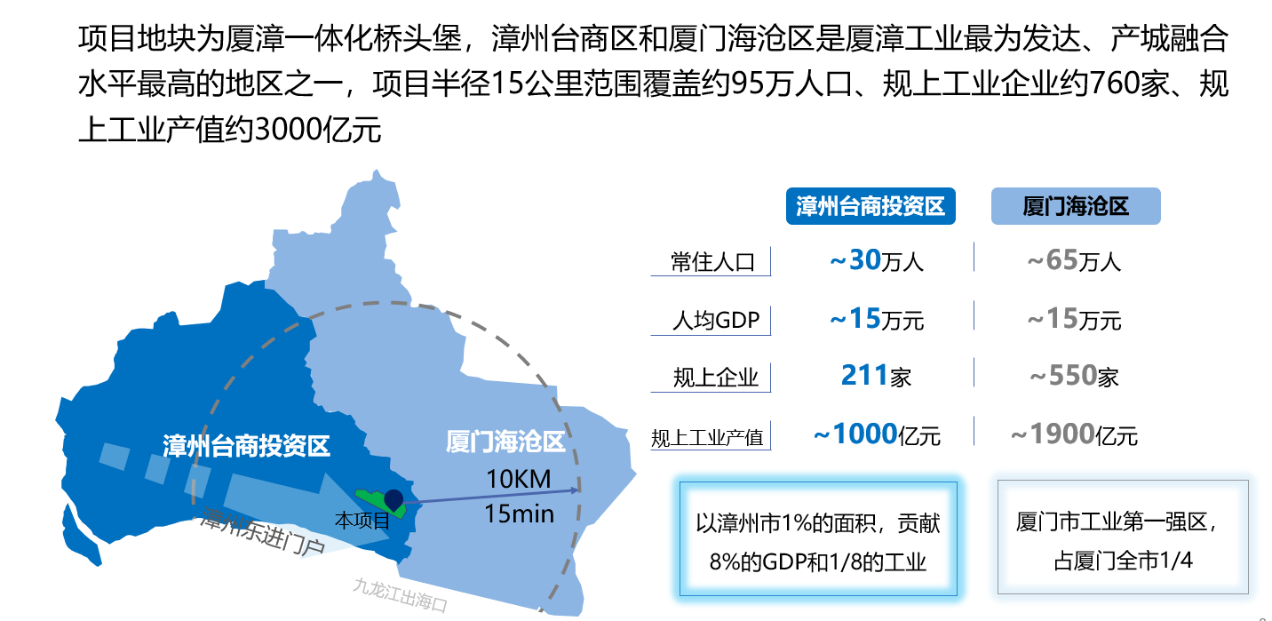 龙池大型工业综合体项目地块处于厦门市环岛“半小时经济圈”,20分钟至厦门岛内,为厦漳一体化桥头堡,漳州台商区和厦门海沧区是厦漳工业最为发达、产城融合水平最高的地区之一,项目半径15公里范围覆盖约95万人口、规上工业企业约760家、规上工业产值约3000亿元。漳州台商投资区是大陆三大台商聚集区之一,是东南沿海重要的制造业中心、都市消费工业出口基地,机械装备、电子信息、建材家居、食品饮料等产业集群发达,累计利用台资位列国家级台商投资区第一位。漳州台商区以漳州市1%的面积,贡献8%的GDP和1/8的工业,2023年实现地区生产总值460亿元,投资总额65亿美元。