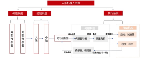 ——执行系统。对应人体的躯干和四肢,负责执行控制系统制定的操作,主要由伺服系统和执行机构组成。“机器肢”指仿人机械臂、灵巧手、腿足等,“机器体”指骨骼、本体结构等。伺服系统是能根据指令信号精确地控制执行部件的运动速度与位置的驱动系统,一般伺服系统由核心零部件电机、驱动器和传感器/编码器组成;传动机构是把动力从机器的一部分传递到另一部分,典型机构有减速器、丝杠、蜗轮蜗杆传动杆等。