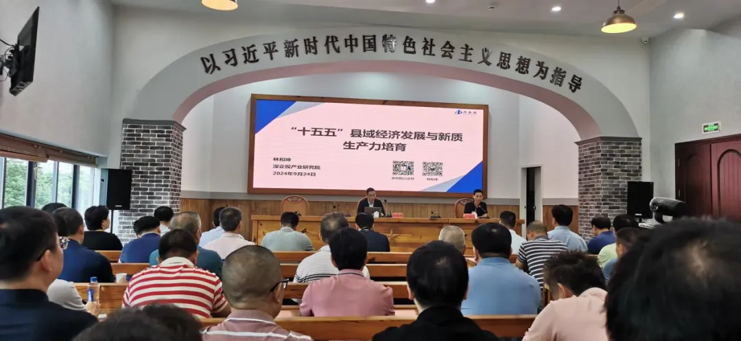2024年9月24日上午,泉州市永春县县管干部学习贯彻习近平新时代中国特色社会主义思想和党的二十届三中全会精神专题研讨班第2期举行,深企投集团创始合伙人、产业研究院院长林和坤受邀作《十五五县域经济发展与新质生产力培育》专题辅导报告。全县100多名县直单位的县管干部在泉州市党内政治生活体验馆参加现场培训,各乡镇(含派出所、市管所、司法所)的县管干部数百人分别在所在乡镇参加线上培训。