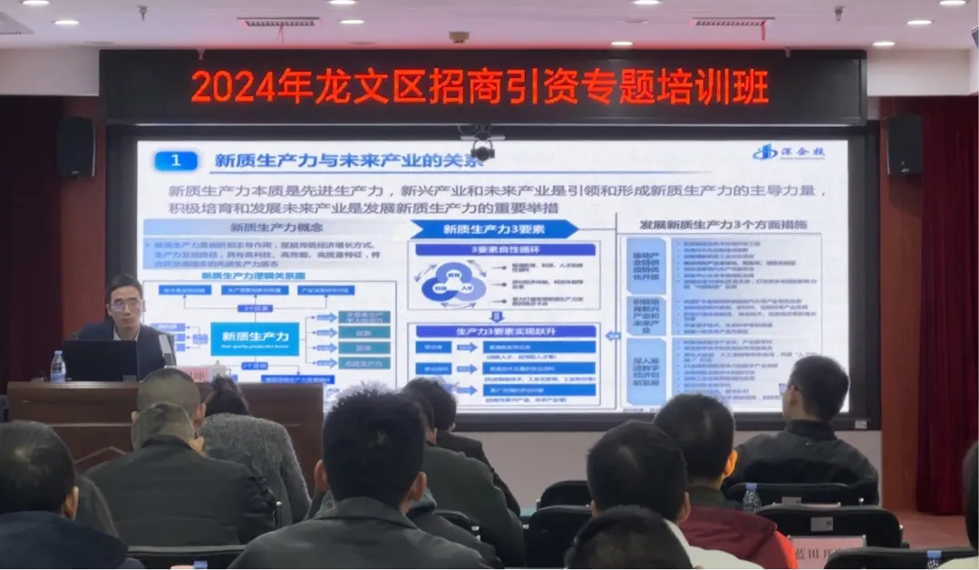 近日,漳州市龙文区委组织部与龙文区商务局联合举办2024年招商引资专题培训班,深企投产业研究院院长林和坤受邀作《未来产业赛道发展现状趋势与龙文发展前景》专题报告,龙文区各镇(街道)、开发区,区直有关单位分管领导、业务骨干以及部分国企代表等60余人参加培训。