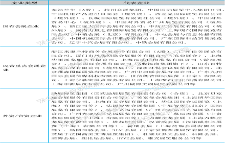 我国会展组展企业主要包括国有会展公司、民营会展企业和外资(含合资)企业三个类别。当前,国有会展公司集团化步伐加快。通过整合国企场馆和会展项目两方面资源,北京、 杭州、武汉、宁波等地成立国有会展集团公司,代表企业如东浩兰生、杭州会展集团等。我国会展组展主要企业如下表所示。
