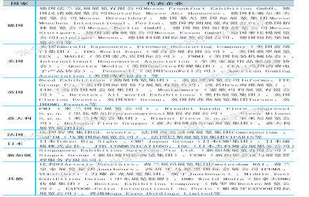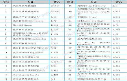 根据德国经济展览委员会(AUMA)在2019年8月年对全球展览公司综合收入进行的调查,全球营收超过1亿元欧元的展览公司如下表所示。
