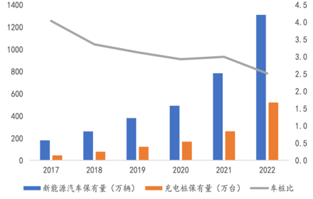 随着新能源汽车的普及推广,充电桩作为新能源的配套基础设施需要加快布局。中国市场新能源汽车销量高速增长。2014年,中国新能源汽车销量仅2.18万辆,2022年销量已经达到687.23万辆,年复合增长率高达105.3%。2022年新能源汽车渗透率达25.6%。截至2022年底,中国新能源汽车保有量达到1310万辆,充电桩保有量达到521万台,车桩比达到2.5:1,相较于2017年4:1有大幅改善。但距离车桩比1:1的发展目标仍有差距。