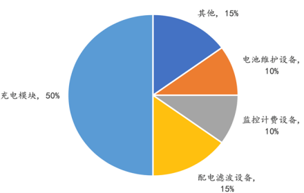 充电设备是充电桩的主要部分,成本占比超90%。其中充电模块应用于直流充电设备,是直流充电桩的核心部件,对电能起到控制、转换的作用,其性能对直流充电设备的整体性能、充电安全等有重要影响。充电模块成本占直流充电桩硬件成本的50%左右,如下图所示。
