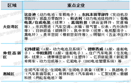 2020年惠州汽车制造业规上企业45家,规上产值189.6亿元,主要分布在大亚湾西区、仲恺高新区和惠城区,产品以动力电池、车载电子以及传统零部件为主,主要为比亚迪和日系整车企业进行配套。惠州新能源汽车及零部件主要企业如下表所示。