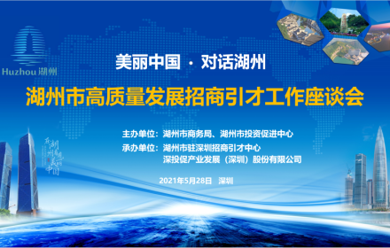 2021年5月28日下午3时,由湖州市商务局、湖州市投资促进中心主办,湖州驻深圳招商引才中心、深投促产业发展(深圳)股份有限公司联合承办的湖州市高质量发展招商引才工作座谈会在深圳成功举行。座谈会上,政企双方展开了深入的交流对话,达成了众多项目投资合作意向。
